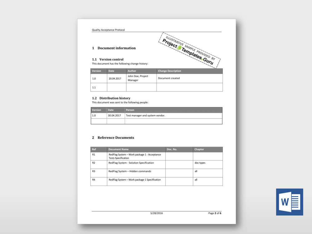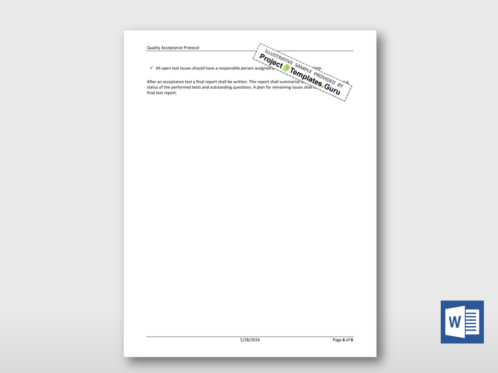 This is a Microsoft Word based quality acceptance protocol. This version is especially useful for acceptance testing of software solutions provided to a customer by a vendor.