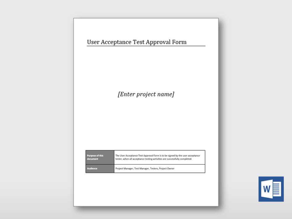 Use this acceptance test approval form to document that the person performing the acceptance quality control of the projects (software) product fully understood and acknowledged the importance and consequence of the acceptance test, including his responsibility as a user acceptance tester.